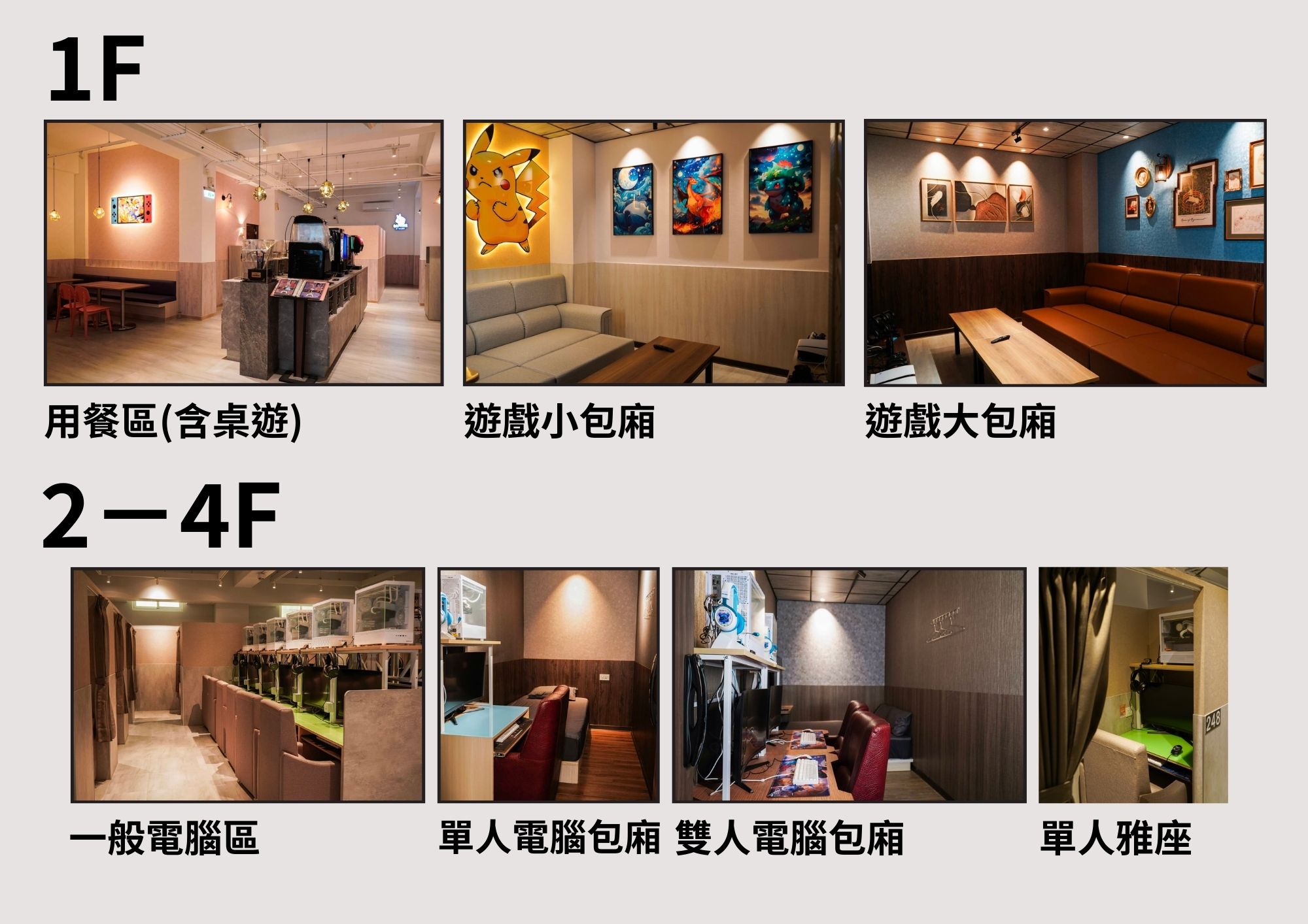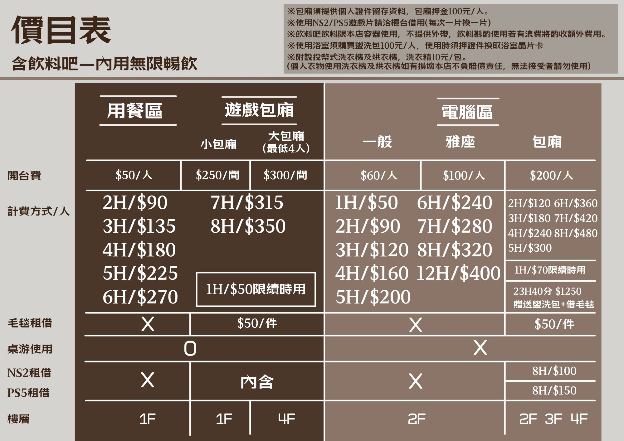 2. 為顧及其他顧客權益,電腦包廂內因無法完全隔音也無法攜帶5歲以下兒童消費,尚請見諒(用餐區及遊戲包廂不受限)。