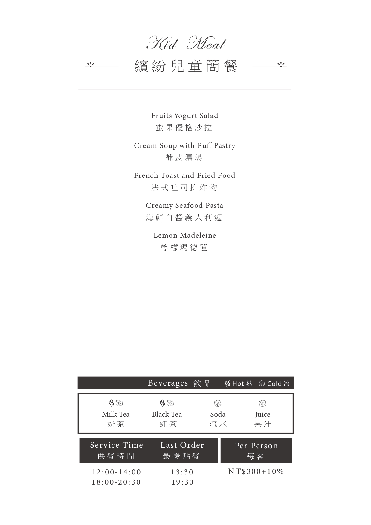 田園簡餐 NT$400+10% / 兒童簡餐 NT$300+10%