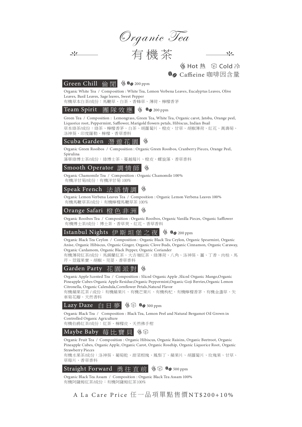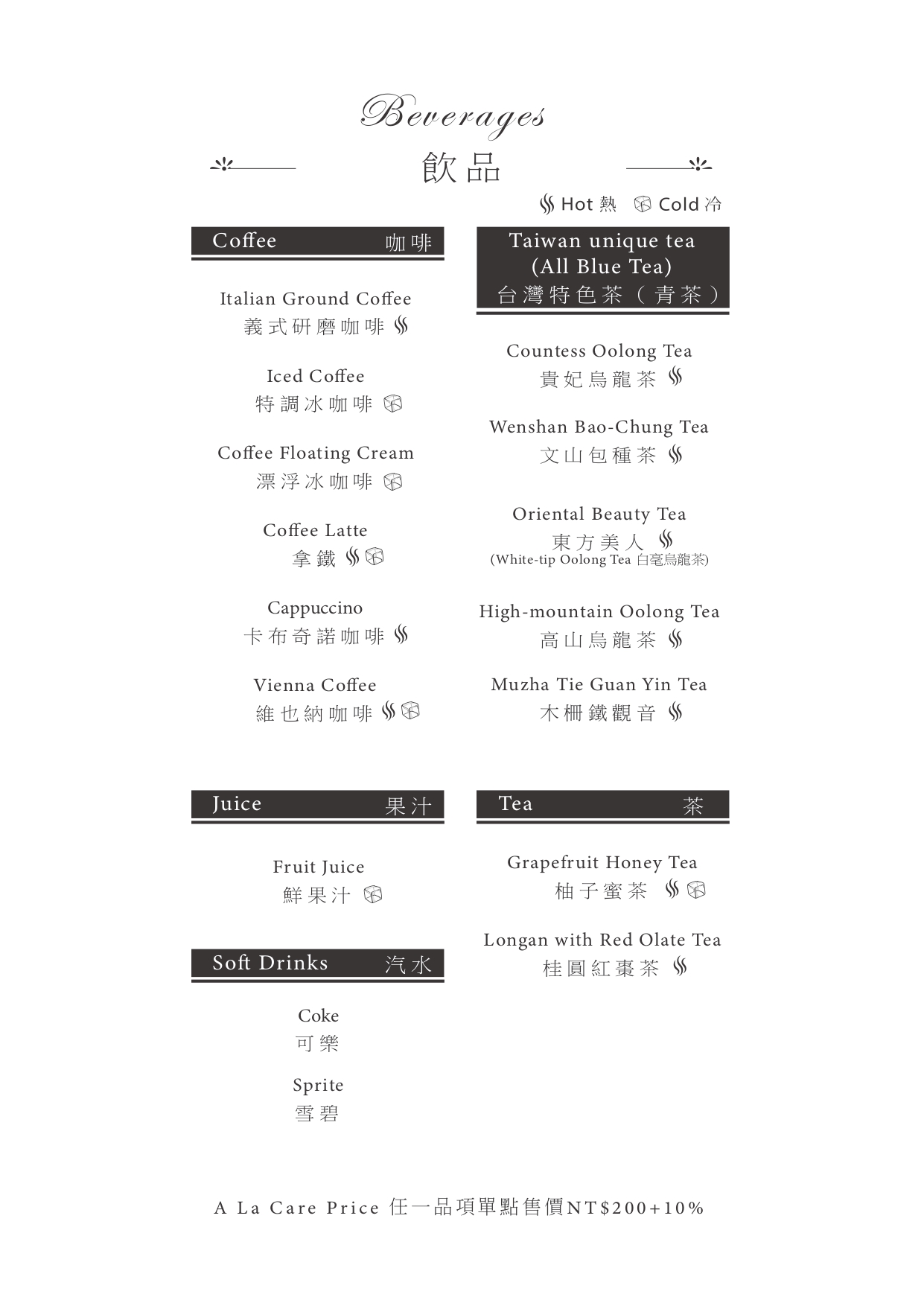 收費標準:每人低消一杯飲品/有機茶 NT$200+10%,可加購西點鹹派