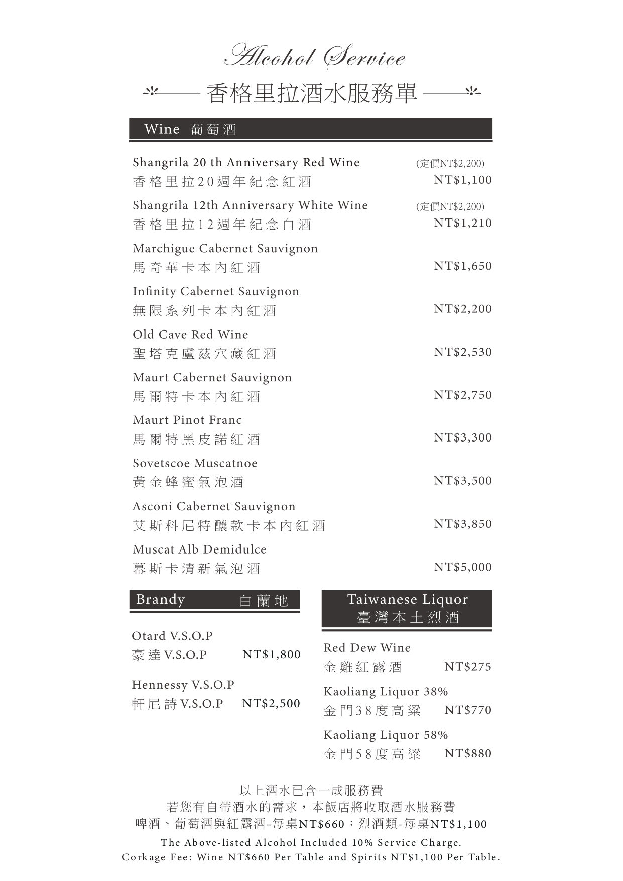 .烈酒類:每瓶(1公升以下)NT$1100