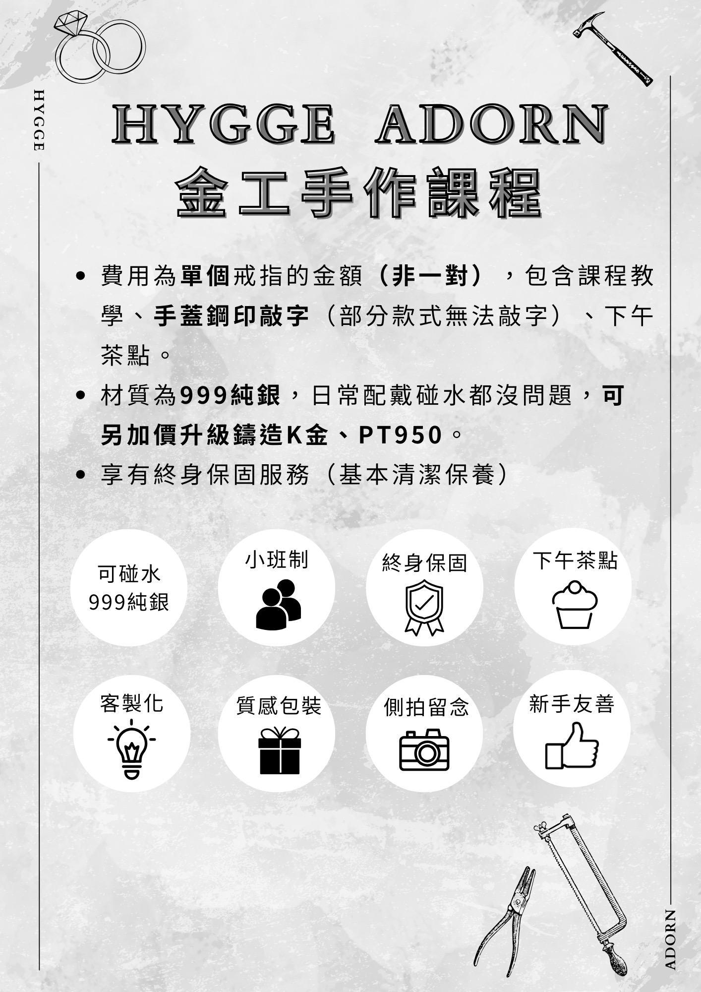 - 為幫學員們紀錄,金工體驗時會協助側拍紀錄,活動結束後,體驗紀錄相片會提供學員們自行下載,部分相片會上傳至HYGGE ADORN Facebook粉絲專頁、Instagram做為活動紀錄等用途,若您不同意請於現場主動告知工作人員。