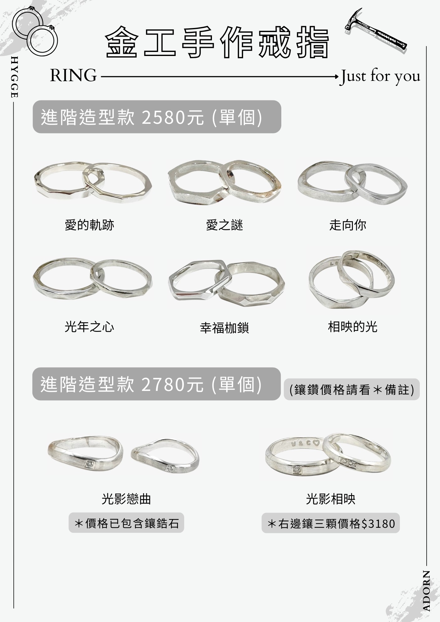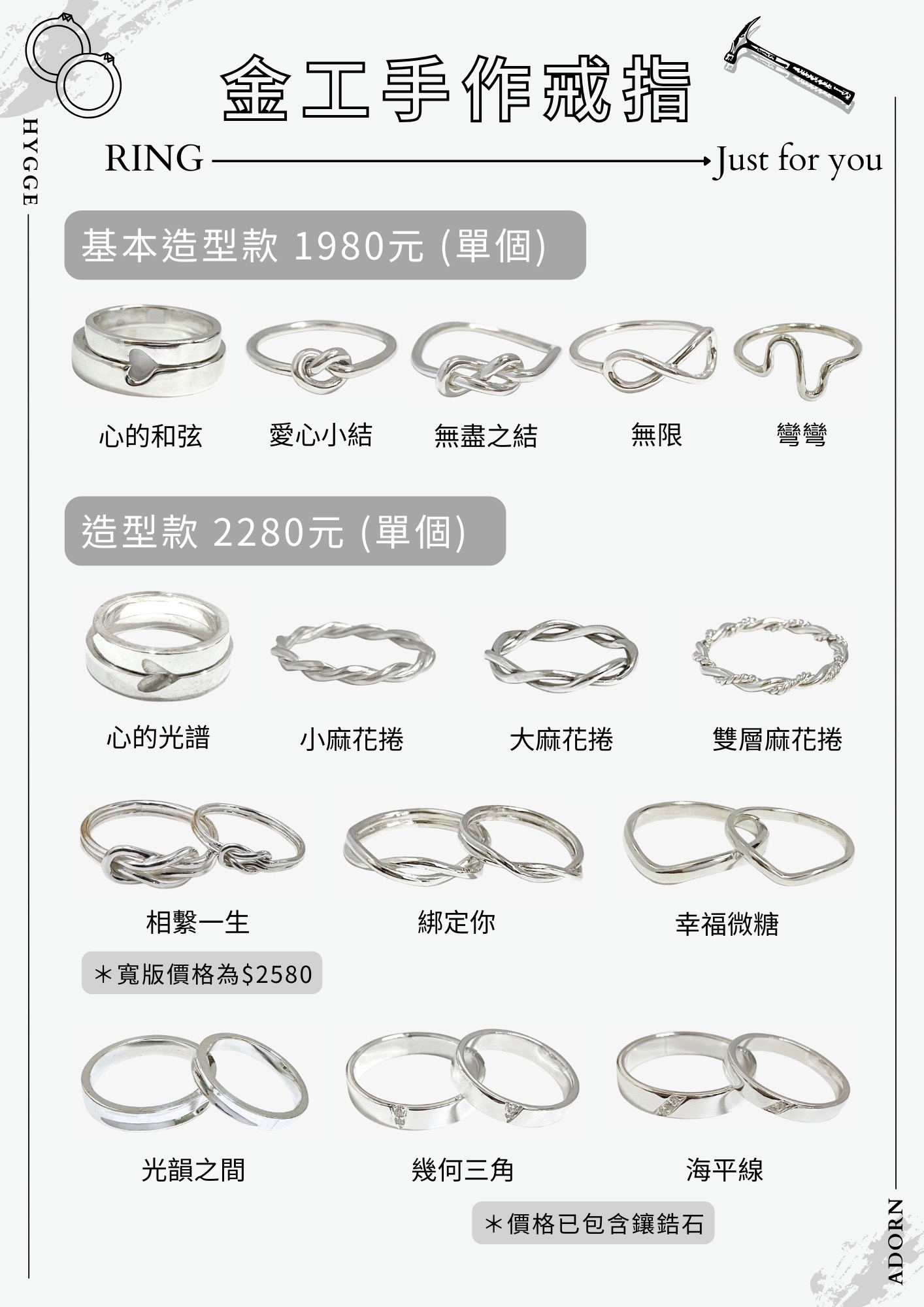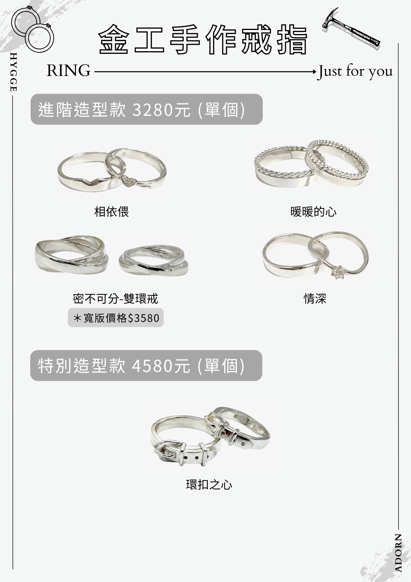 1. 課程教學、親自手作的成品、包裝、手蓋鋼印刻字、保固卡、下午茶點心,明細上費用為單只戒指的金額。