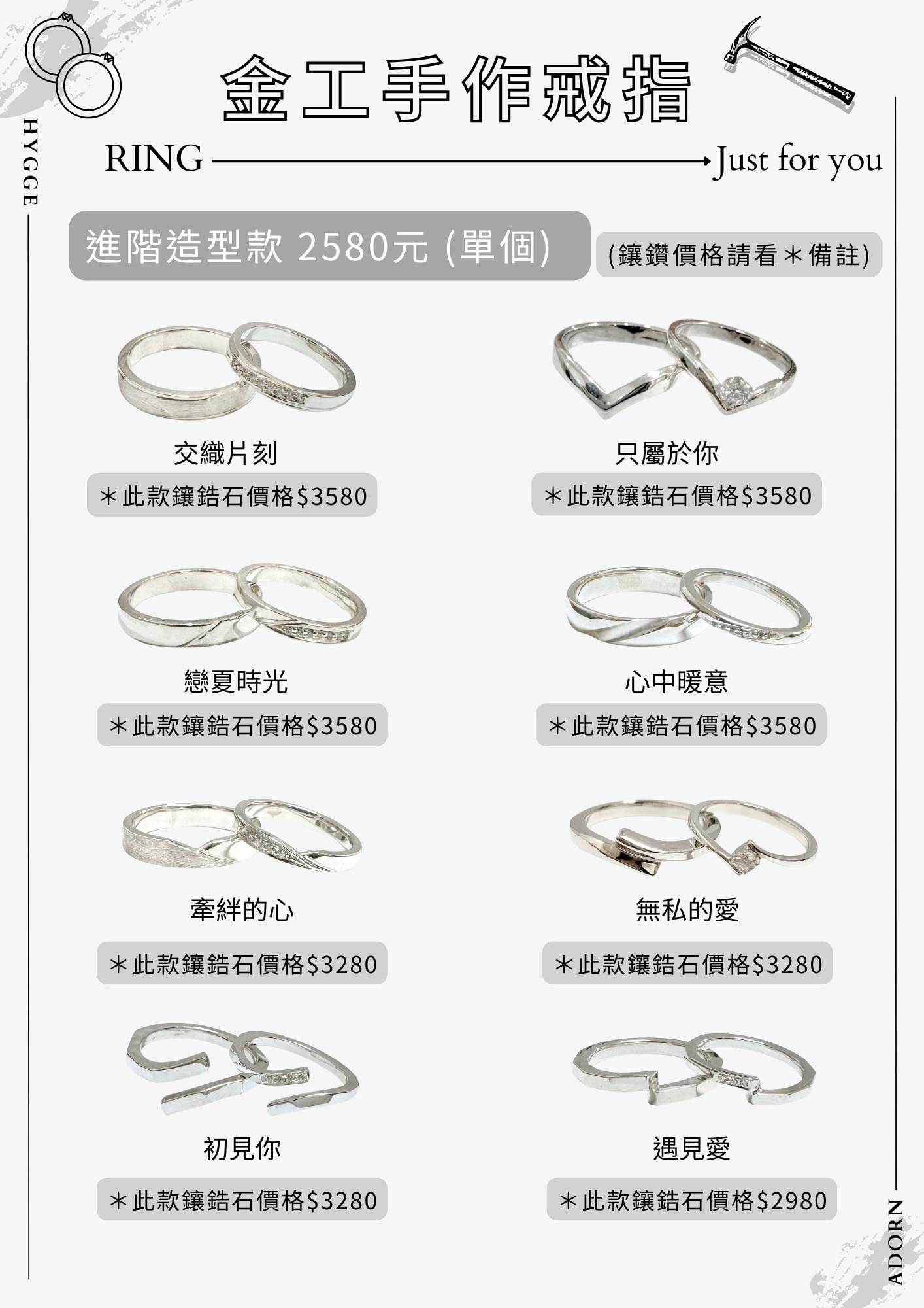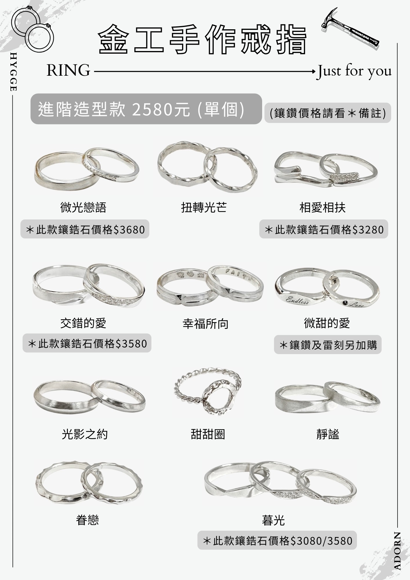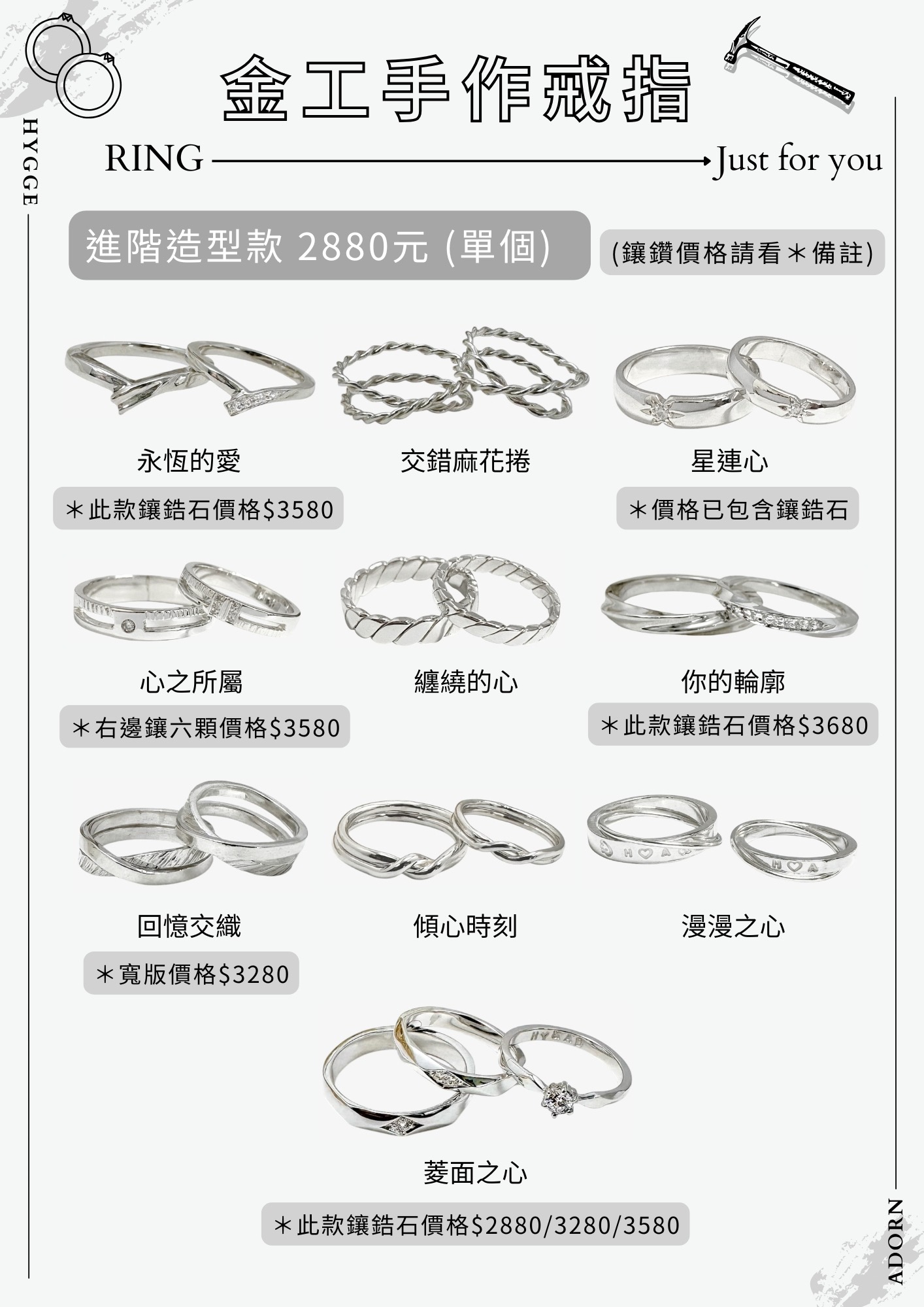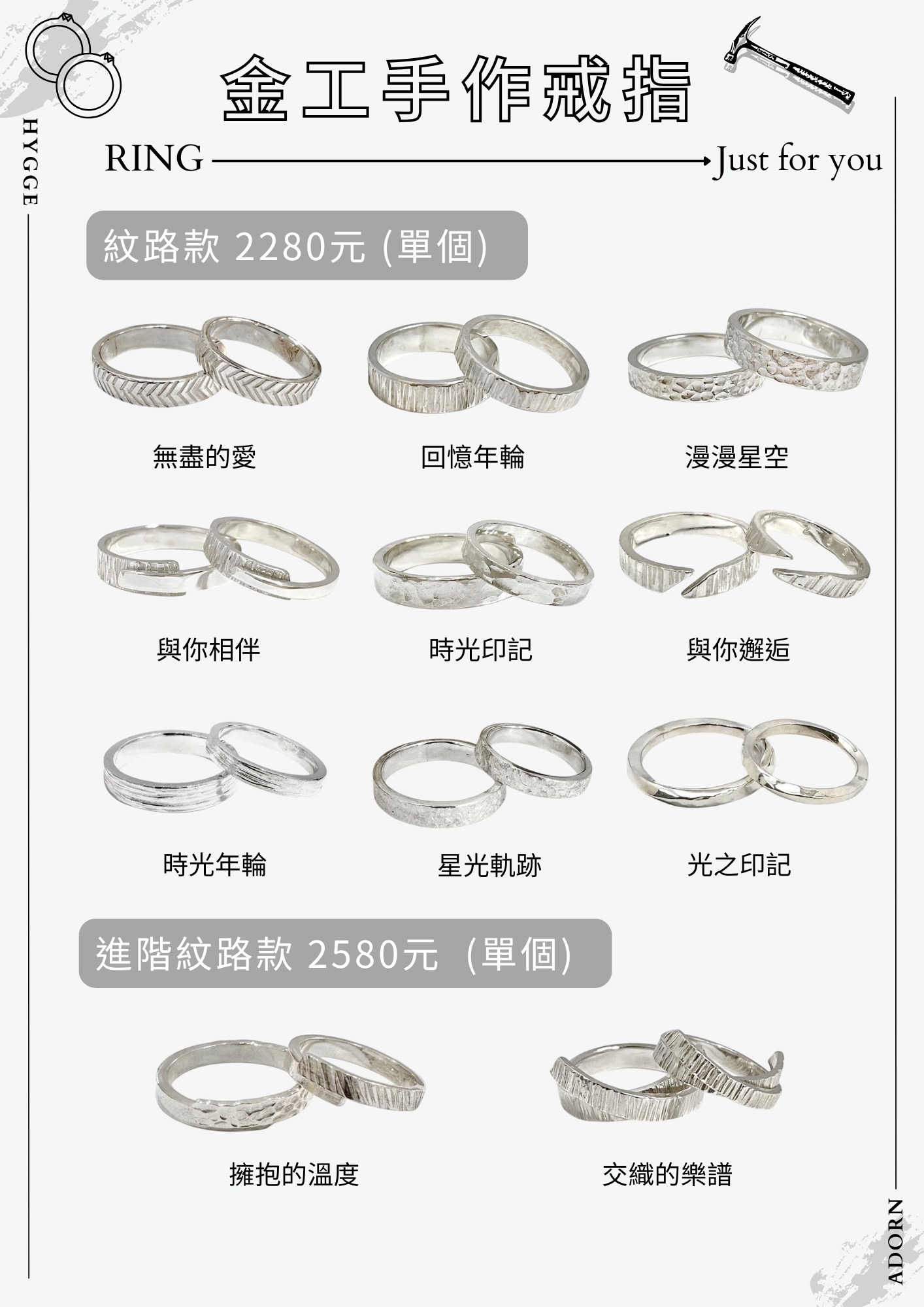 1. 課程教學、親自手作的成品、包裝、手蓋鋼印刻字、保固卡、下午茶點心,明細上費用為單只戒指的金額。